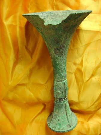 那段時間回家以后,就把它捧在手上欣賞一番??吹剿?,工作中的壓力、身心的勞累就云消霧散了。十幾天過去后,一天日光很好,我用竹簽清理黏在銅觚外皮的殘土,發(fā)現(xiàn)小土塊將綠銹粘了下來。不對呀!繼續(xù)清理,不少銅銹不太費(fèi)力就被剝離下來,我的冷汗就下來了。靜下心來重新審視,發(fā)現(xiàn)找不到范線,然后又發(fā)現(xiàn)銅觚的大口沿,平均厚度不足一毫米,而商代青銅觚的口沿厚度一般在2至3毫米,口沿的殘破處用手一撥,發(fā)出高頻清脆的顫音,真器是不會有這種聲響的,因?yàn)樵诘叵侣癫厝Ф嗄甑牟牧?,?nèi)應(yīng)力已經(jīng)消失,是不會出現(xiàn)這種彈性的,一切都明白了,后悔當(dāng)時頭腦發(fā)熱沒有冷靜地多看多思。