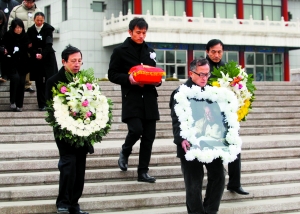 昨天是正月十五,氣溫下降,來自山東、深圳、河北等地的送別人群頂著寒風等候在八寶山公墓停車場,為張仃先生送行。下午2時15分左右,張仃先生的靈車到達八寶山,按照張老生前遺囑,張仃先生的親屬只在停車場舉行了極其簡單的告別儀式。