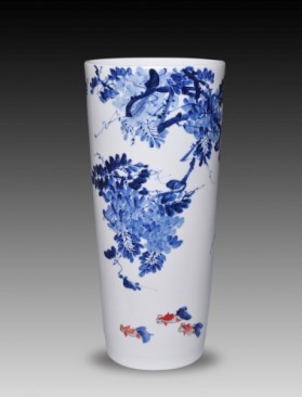 過種跨界的合作,在近年來的拍賣場上還是得到了不少藏家的追捧,拍出了不錯的價格。比如范曾 “老子演義青花畫缸”的134.4萬元、江宏偉”留得殘荷聽雨聲 釉上彩瓷瓶”的13.4萬元、徐樂樂“陸羽品茶圖青花筆筒”的10.9萬元等。