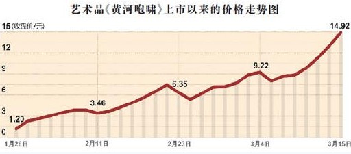 同一天,第一批兩只藝術(shù)品《黃河西來決昆侖咆嘯萬里觸龍門》(簡稱黃河咆嘯)與《燕塞秋》已接近15元大關(guān),漲幅超過10倍。