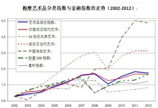 梅摩指數(shù)在西方市場(chǎng)已處于相對(duì)成熟的狀態(tài)。鑒于中國藝術(shù)品市場(chǎng)發(fā)展時(shí)間短,反復(fù)成交的藝術(shù)品數(shù)量不多,不足以形成曲線,因此梅摩指數(shù)統(tǒng)計(jì)的主要是西方藝術(shù)品,只在近年針對(duì)個(gè)別中國藝術(shù)品門類進(jìn)行了嘗試性的統(tǒng)計(jì)。