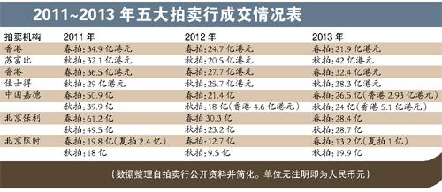 市場上像羅先生這樣的人并不少。據(jù)本報(bào)獨(dú)家整理的數(shù)據(jù)顯示,香港蘇富比、香港佳士得、中國嘉德、北京保利、北京匡時(shí)五大拍賣行在2011年~2013年的成交情況基本呈現(xiàn)一個(gè)趨勢:2011年最高,2012年回落,2013年略好于2012年,但大多數(shù)未達(dá)到2011年的水平。