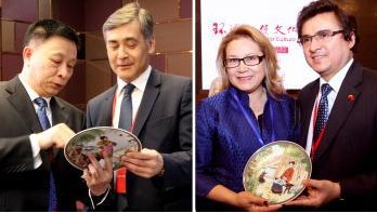 景德鎮(zhèn)副市長(zhǎng)黃康明向眾駐華大使贈(zèng)送《紅樓夢(mèng)十二金釵藝術(shù)彩盤》