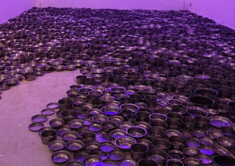 “在東莞的工業(yè)區(qū)里,李景湖從距離他工作室不遠的廢品市場購買和搜集用過的容器,主義是不銹鋼餐具。這些容器盛滿水后,被放置在一層畫廊的場域內。這仿佛是在詩意地召喚臨近卻又缺失的大海,我們簡直可以感覺到工廠似乎吹起了涼爽的海風。”于是藝術家認為,大部分沒有見過大海的內地工人對海的憧憬成了他們爭取美好生活的“隱喻”。顯然藝術家的出發(fā)點是好的,既有詩意的浪漫,又有人性的關愛。二手的器皿隱含著種種的社會關系,失敗在于“水”這個媒材的選擇上——裝生水、熟水、礦泉水、洗澡水還是海水,它直接關系著作品是否成立的問題。藝術家在這個選擇上是不考究的,既然要引發(fā)觀者對于海的聯(lián)想,為什么不將這些器皿裝上海水?如果展廳中還能隱隱約約聞見淡淡的腥,是不是更有詩意?作品的安置也不具有空間感,光線也錯亂,其視覺的效果就是:放在地上一堆浩浩蕩蕩待洗的碗。